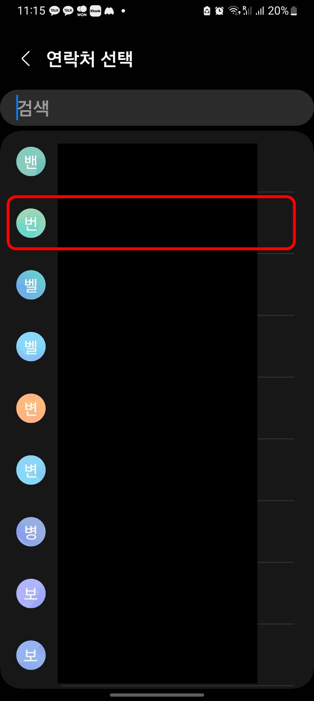 휴대폰에 저장된 연락처 목록이 표시됩니다. 검색창을 이용하여 지정할 연락처를 검색하거나 스크롤을 내려 지정할 연락처를 선택합니다.