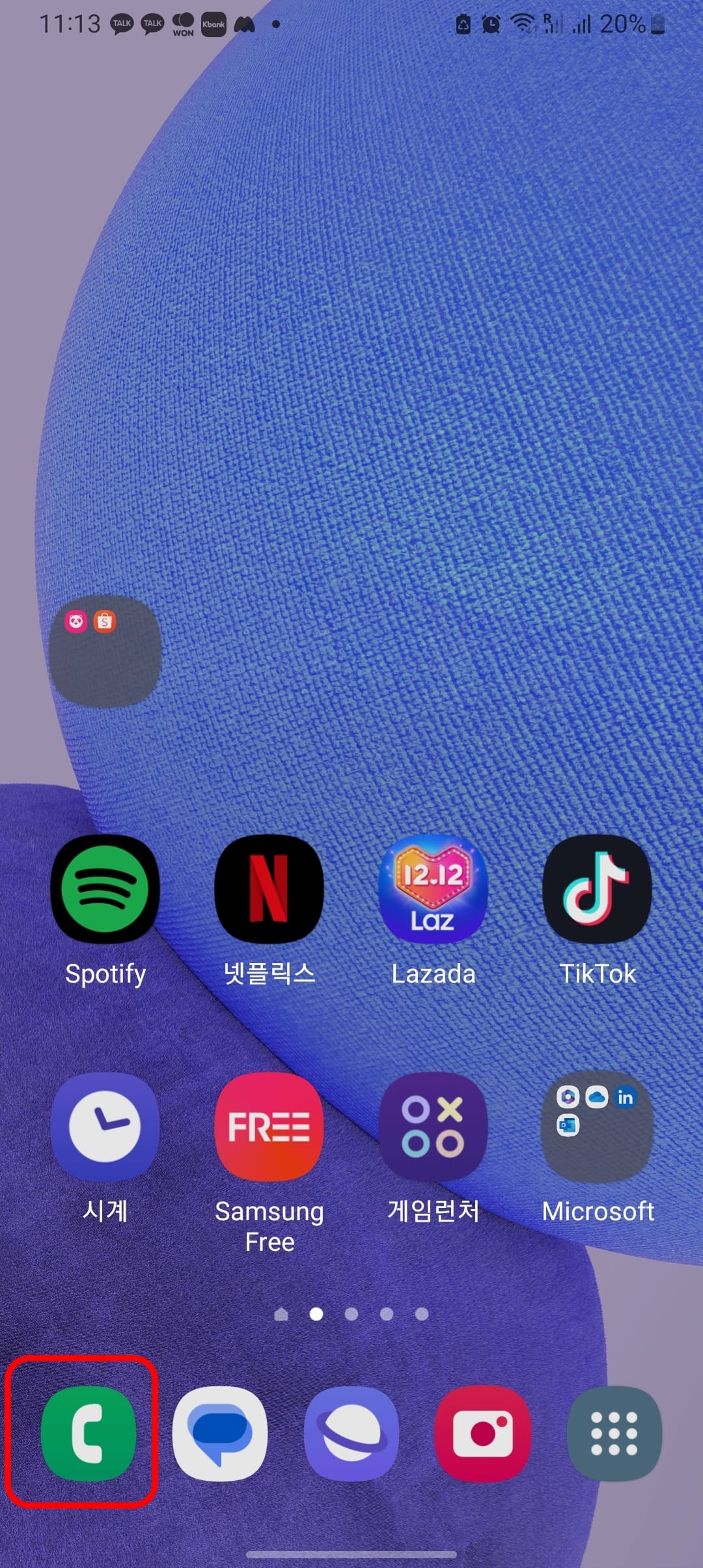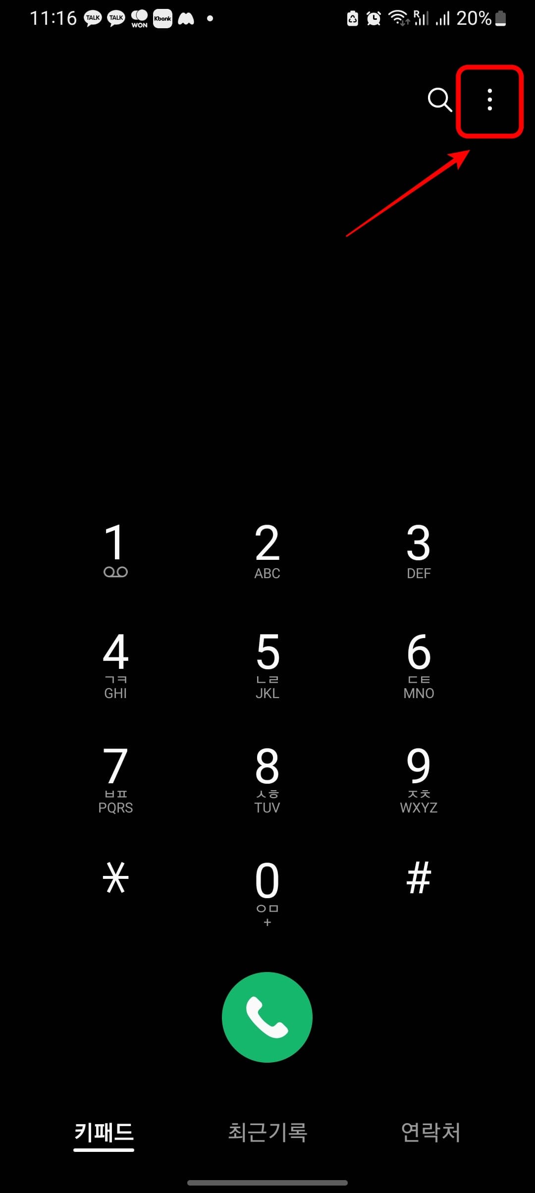 핸드폰 단축번호지정을 하려면 먼저 휴대폰 홈화면에서 하단의 전화 아이콘을 터치합니다. 이후 하단에서 키패드를 터치한 후 우측 상단의 점 3개 아이콘을 터치합니다.