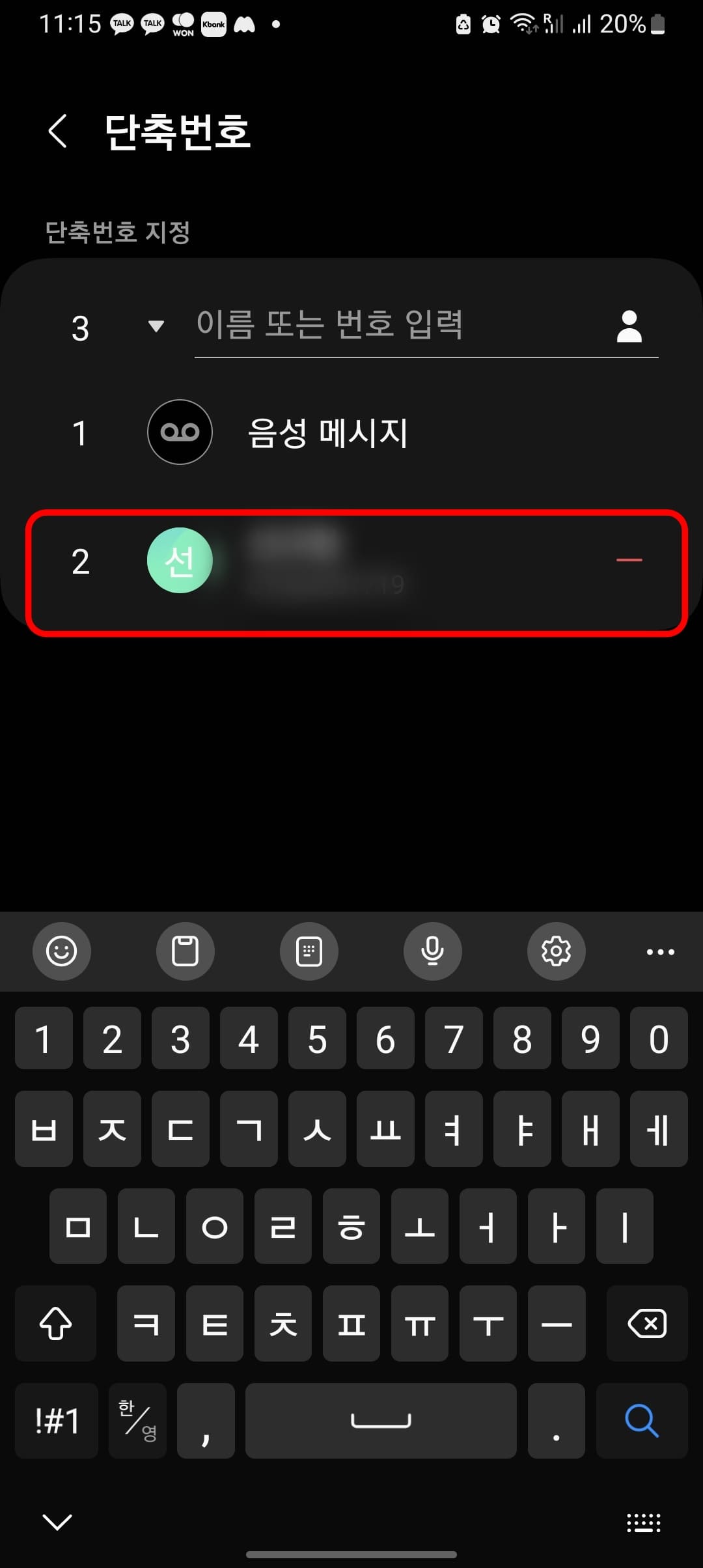 연락처 지정이 완료되면 위의 사진처럼 2번에 새로운 단축번호가 지정된 것을 확인할 수 있습니다. 이제 단축번호를 사용하여 연락처에 전화를 걸어보도록 하겠습니다.