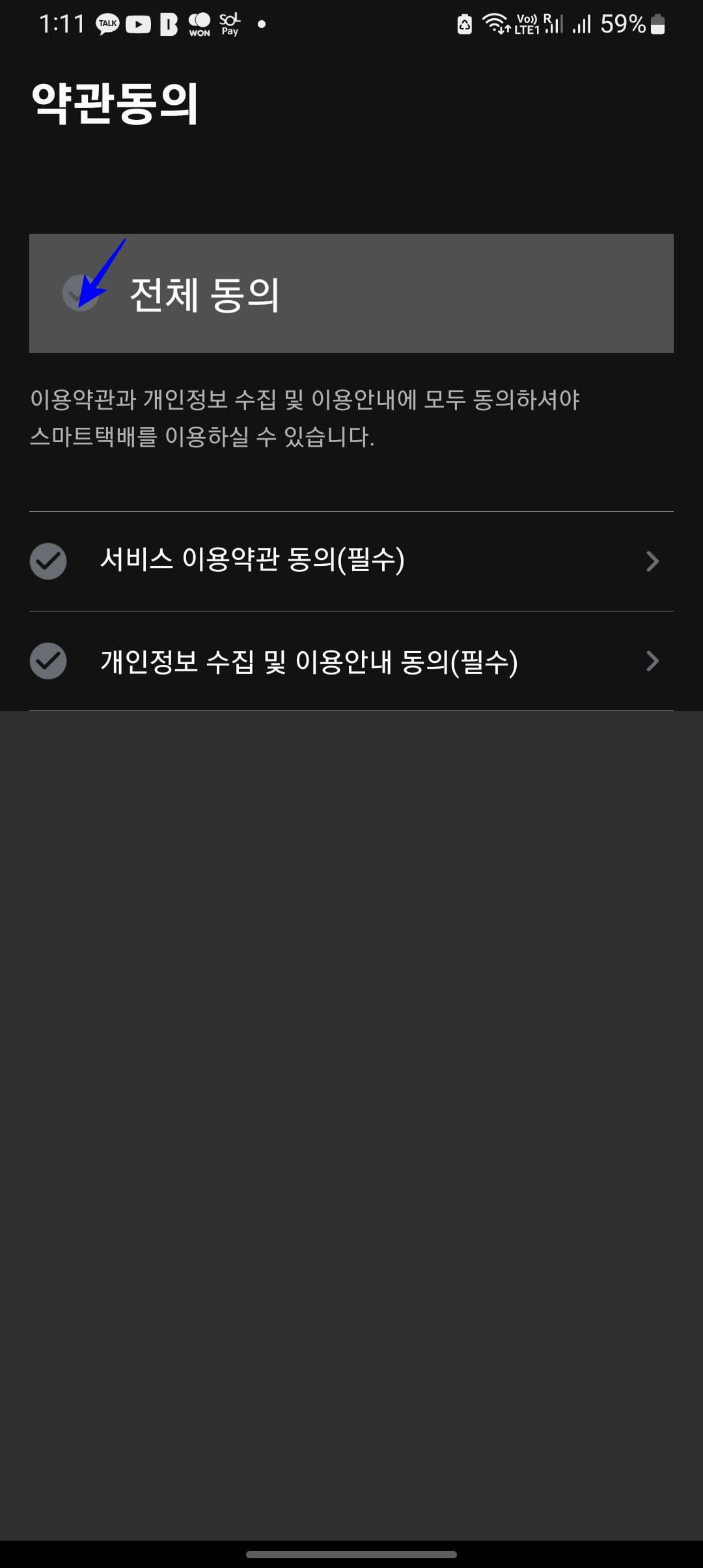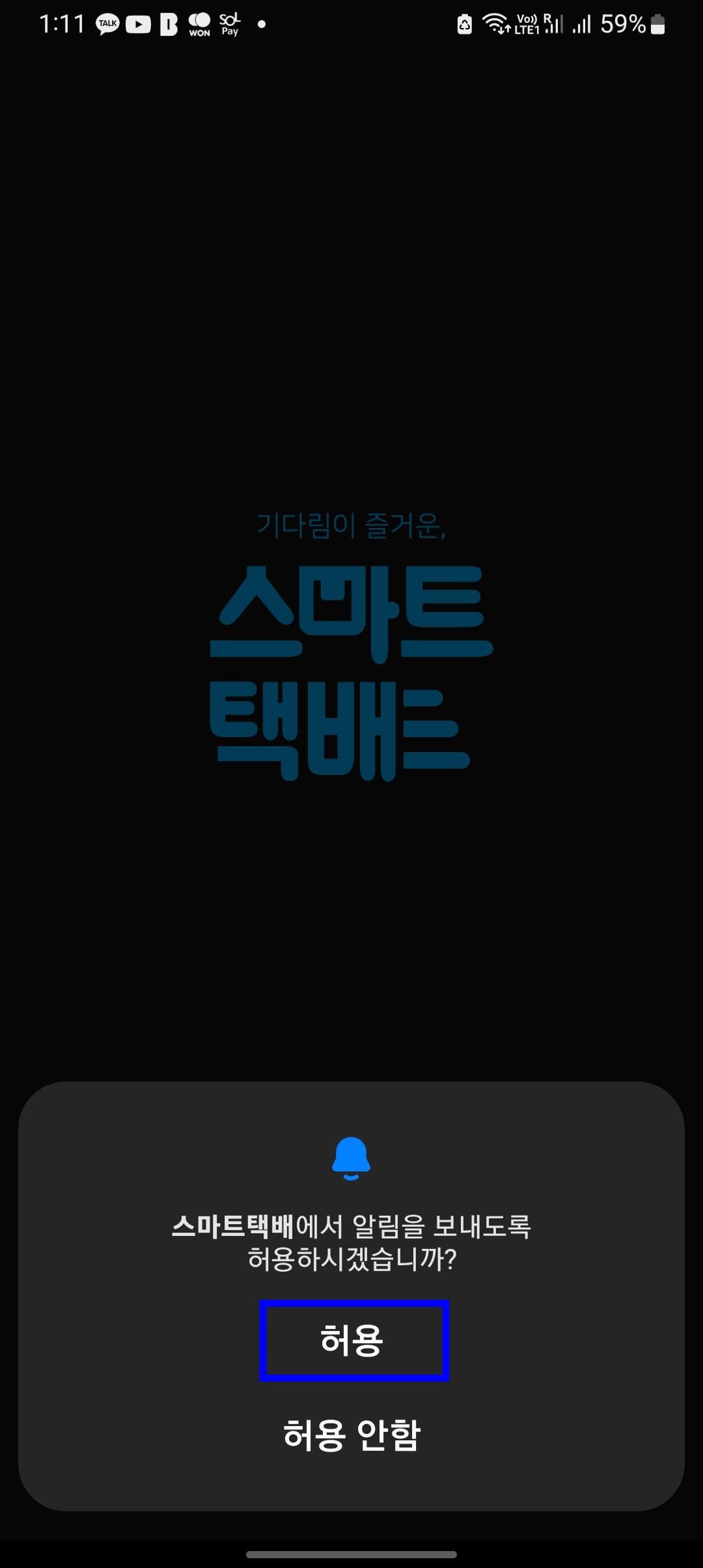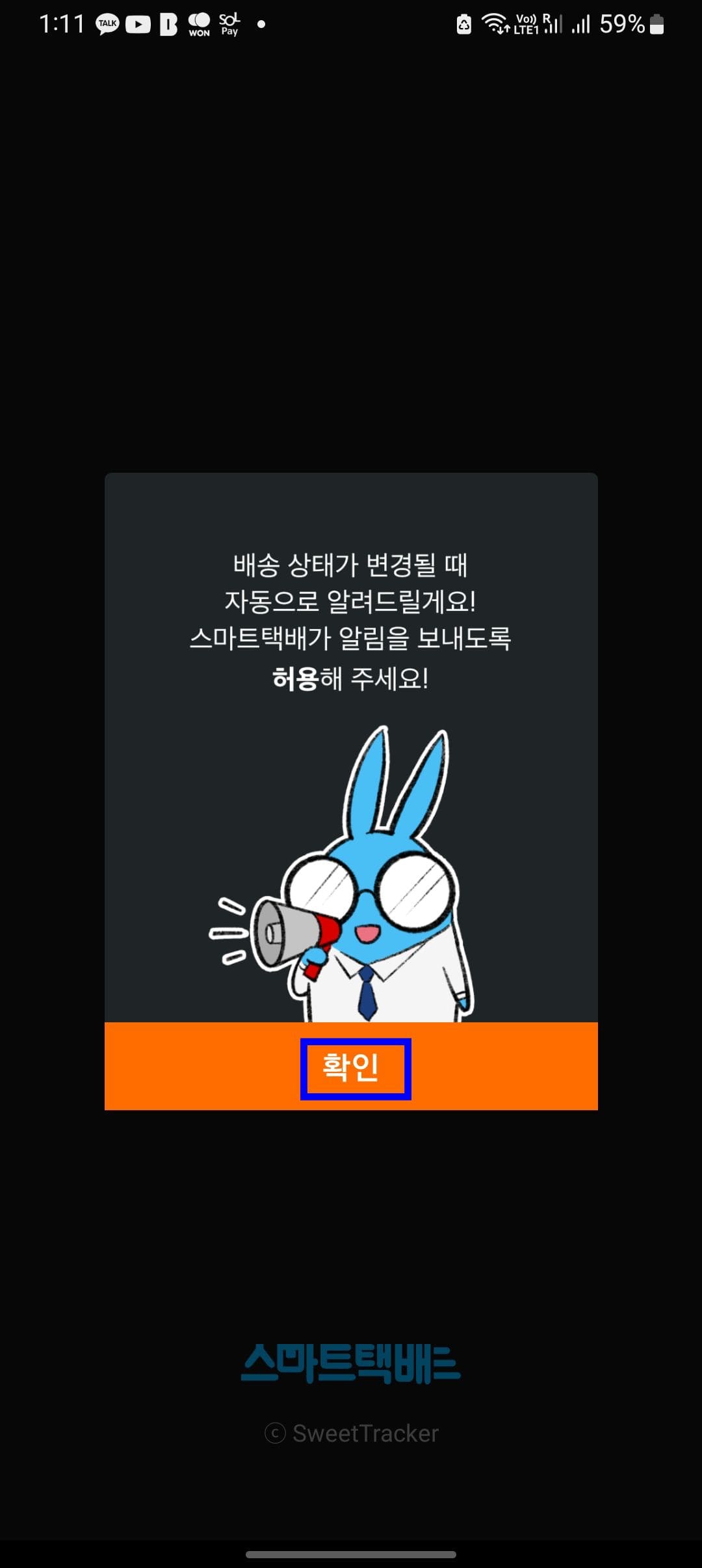 스마트택배 앱 설치후 실행하시면 위와 같은 첫 화면을 볼 수 있습니다. 최초 앱권한 허용을 위해 확인 버튼을 터치합니다. 택배 배송 상태가 변경될 때 알림을 받으시려면 알림을 허용하도록 합니다.