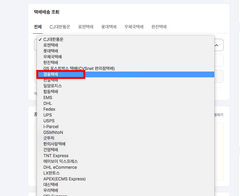 쇼핑몰 연결이 완료되었다면 최근 배송 메뉴 우측의 전체보기를 선택합니다. 이후 배송목록 페이지에서 현재 배송 중인 경동택배 배송조회를 할 수 있습니다.