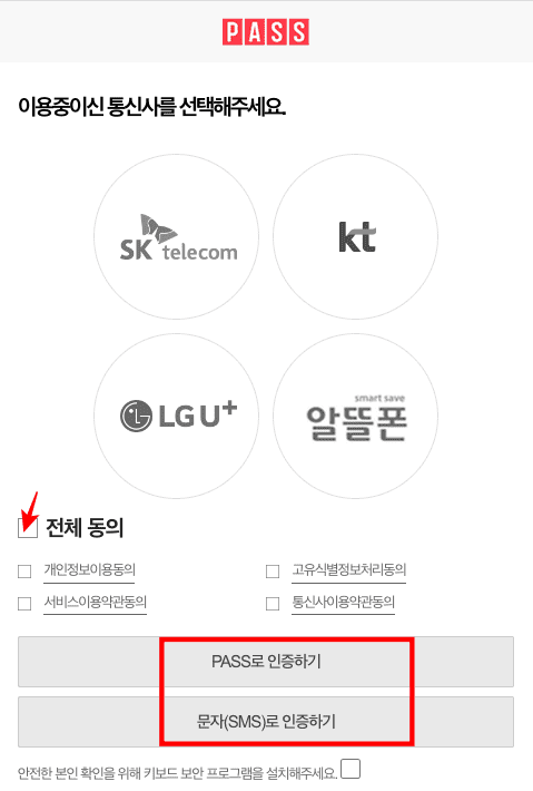 만약 미납통행료가 있는 경우에는 위의 화면처럼 미납통행료가 있다고 표시되며 본인인증 이후 납부가 가능합니다. 하단의 개인/외국인 본인인증을 클릭합니다. PASS 인증이 표시되면 이용 중인 통신사를 선택하고 전체동의 표시 후 PASS앱으로 인증하기 또는 문자로 인증하기를 선택합니다. 이후 인증이 완료되면 미납통행료를 실시간으로 납부할 수 있습니다.
