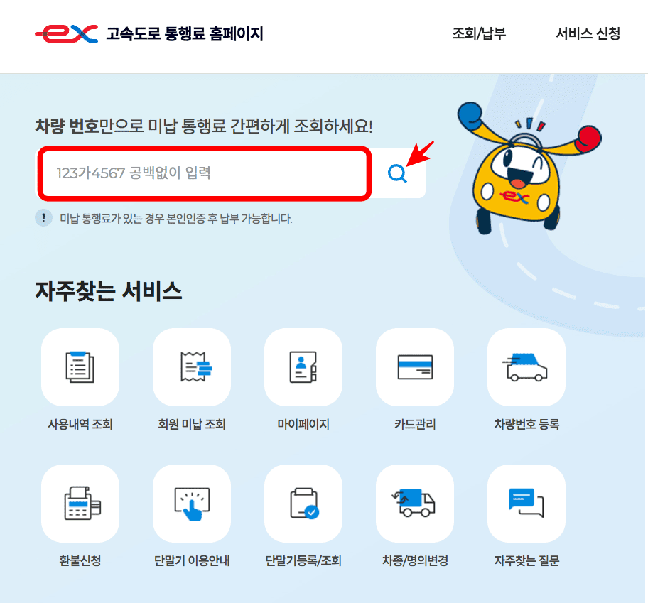차량 번호만으로 미납 통행료 간편하게 조회하세요! 미납 통행료가 있는 경우 본인인증 후 납부 가능합니다.