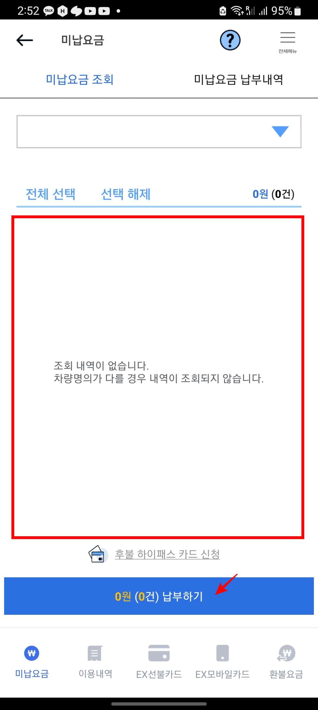 조회한 차량번호에서 미납 내역이 없다면 위와 같은 화면을 볼 수 있습니다.
