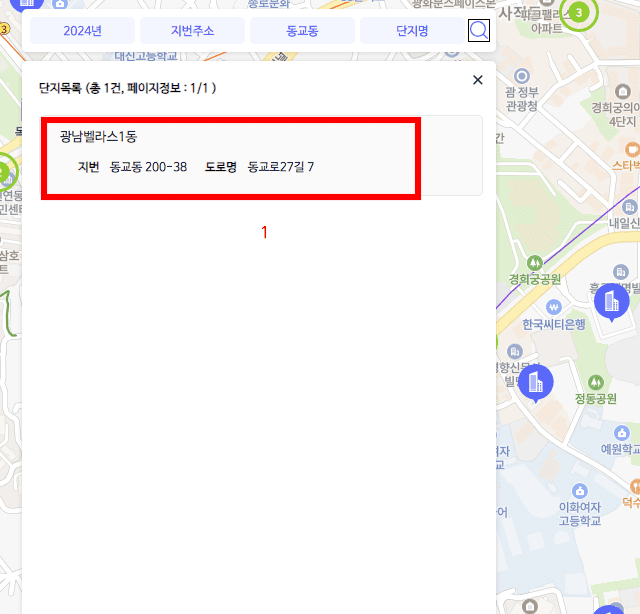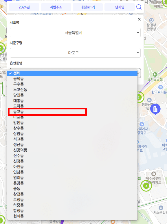 지도 화면이 표시되면 좌측 상단 메뉴에서 지번 주소를 입력하시거나 지역을 선택할 수 있습니다. 표시된 부분을 클릭하면 지역 선택 메뉴가 나옵니다. 시도명, 그리고 시군구명을 선택합니다. 이어서 읍면동명을 선택하고 우측의 돋보기 아이콘을 클릭합니다.