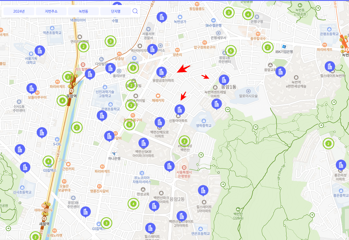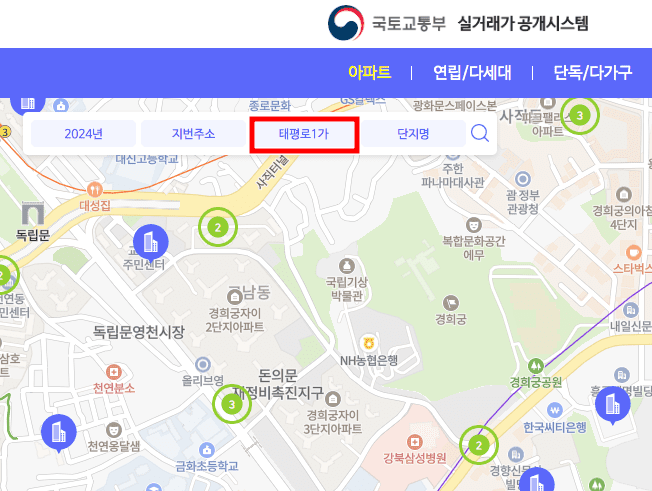 국토해양부 아파트실거래가조회를 검색이 아닌 지도에서 확인하는 방법도 있습니다. 지도 화면에서 내가 조회하고 싶은 지역으로 이동합니다. 이후 해당 지역에서 파란색으로 표시된 아이콘을 선택하면 해당 단지의 실거래가 조회가 가능합니다.
