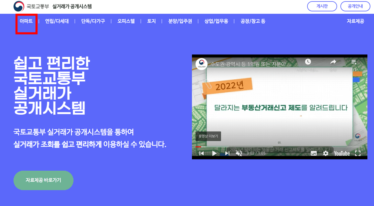 실거래가 공개시스템에 방문하시면 위와 같은 메인 페이지를 확인할 수 있습니다. 상단 메뉴에서 [아파트]를 선택합니다.