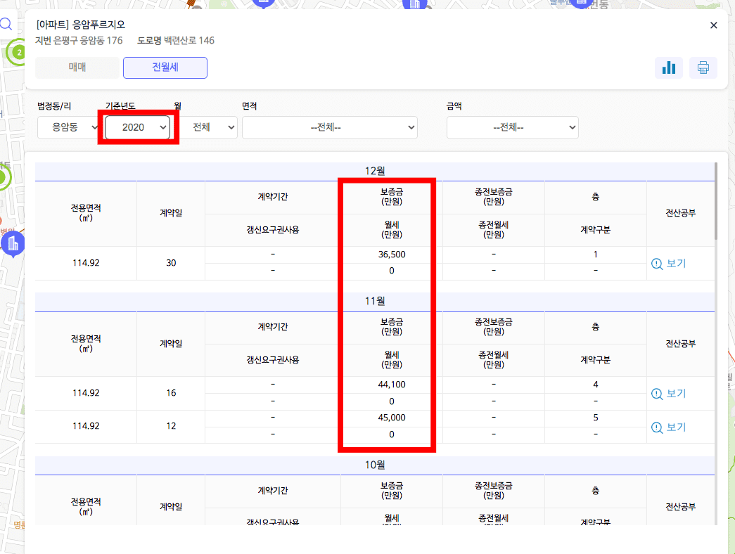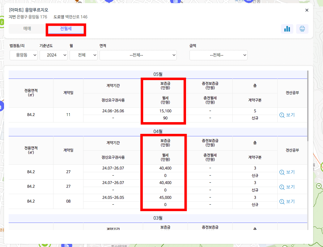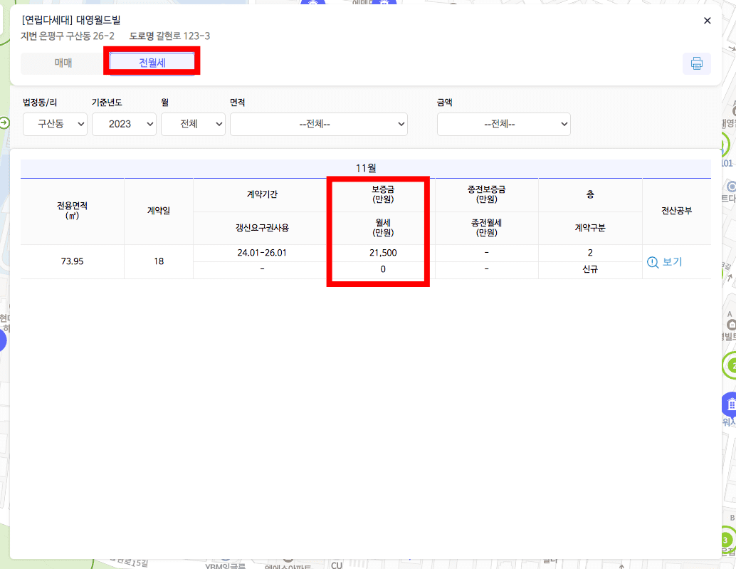 상단에서 [전월세]를 선택하면 전월세 계약 내용을 조회할 수 있습니다.