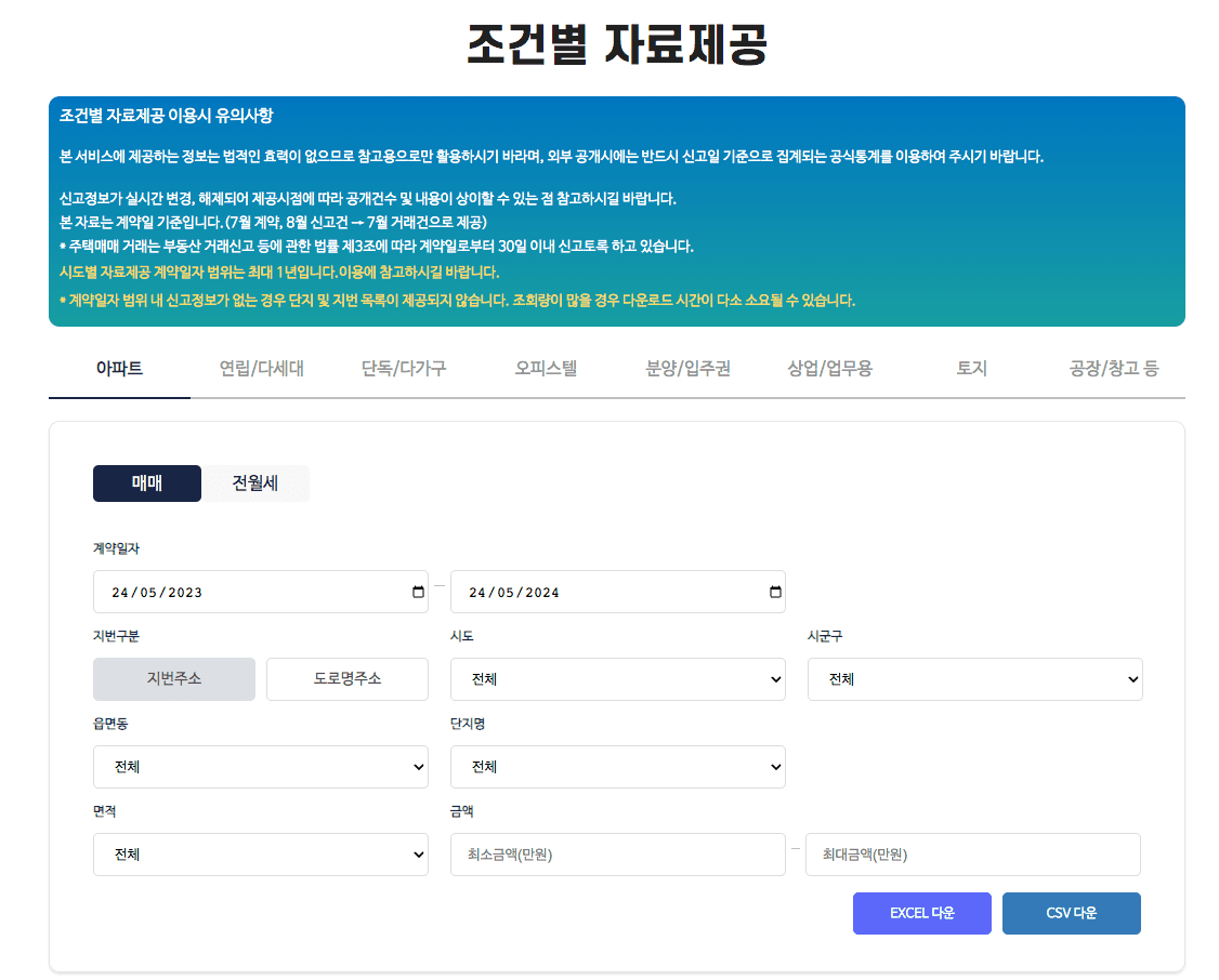 조건별 자료제공 페이지가 표시되면 매매 또는 전월세를 선택하고 계약일자 기간, 시도, 시군구, 읍면동, 단지명, 면적, 금액 등을 선택하고 하단의 엑셀 또는 CSV를 선택하면 컴퓨터로 조건별 자료가 저장되니 참고하시기 바랍니다.