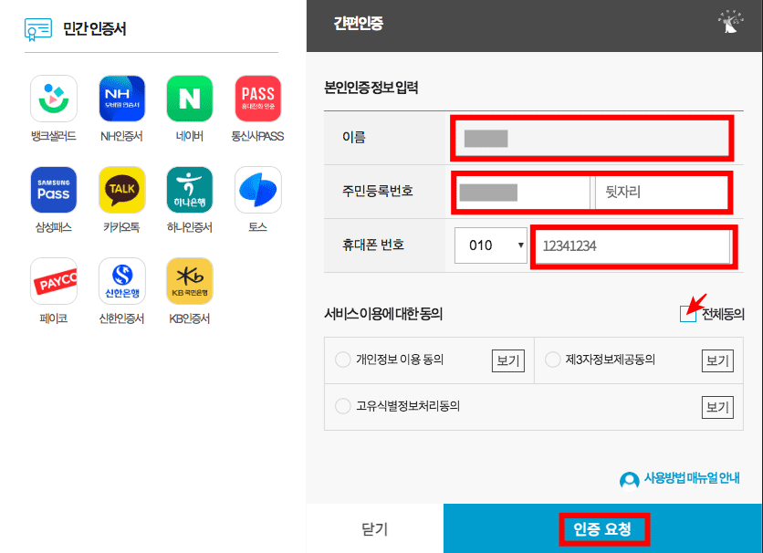 간편 인증 페이지가 표시되면 좌측에서 보유한 민간인증서를 선택하고 우측에 이름, 주민등록번호, 휴대폰번호 입력 후 서비스이용에 대한 전체동의를 체크합니다. 이후 하단의 인증요청 버튼을 클릭하면 휴대폰으로 인증 메시지가 알림으로 표시됩니다. 휴대폰에서 인증을 마치시기 바랍니다.