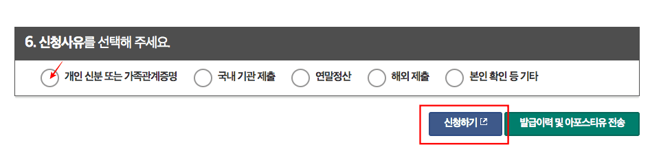 마지막으로 신청사유를 선택하고 하단의 신청하기 버튼을 클릭하면 됩니다.