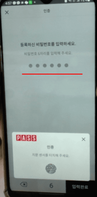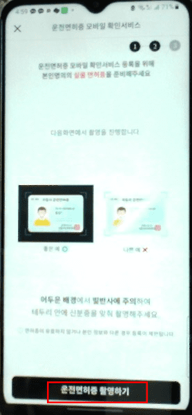 다시한번 등록한 6자리 비밀번호 또는 지문인증을 합니다. 운전면허증 모바일 확인서비스 페이지가 표시되면 실물 운전면허증을 준비하시고 하단의 운전면허증 촬영하기를 터치합니다. 휴대폰 카메라가 활성화되고 붉은 사각형 내에 실물 운전면허증을 맞추면 자동으로 촬영됩니다.