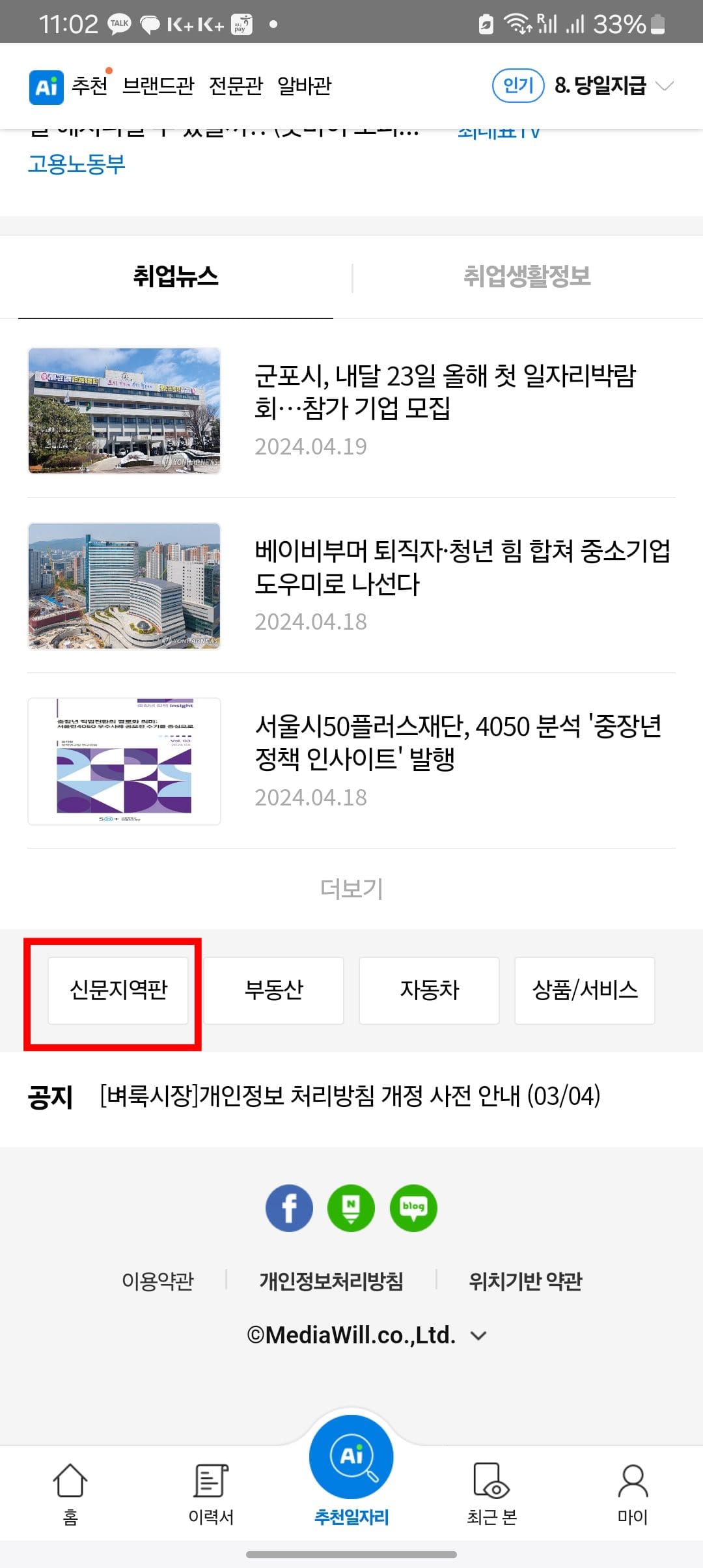벼룩시장 앱을 실행하시면 위와 같은 화면을 보게 됩니다. 하단의 [건너뛰기] 버튼을 터치합니다. 벼룩시장 메인 화면이 표시되면 스크롤을 내려 제일 마지막으로 이동합니다. 좌측 하단의 [신문지역판] 메뉴를 터치합니다.