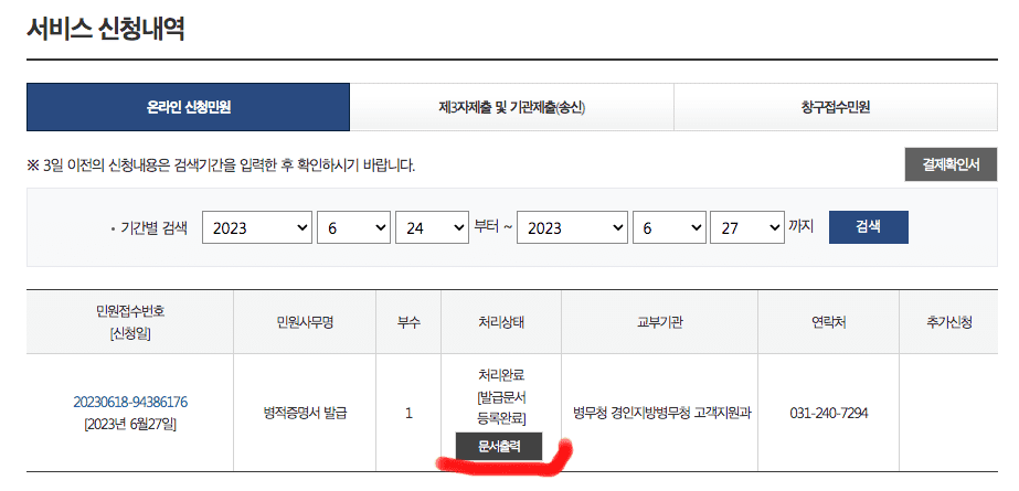 서비스 신청내역에서 병적증명서가 발급된 것을 확인할 수 있습니다. 문서 출력 버튼을 클릭합니다.