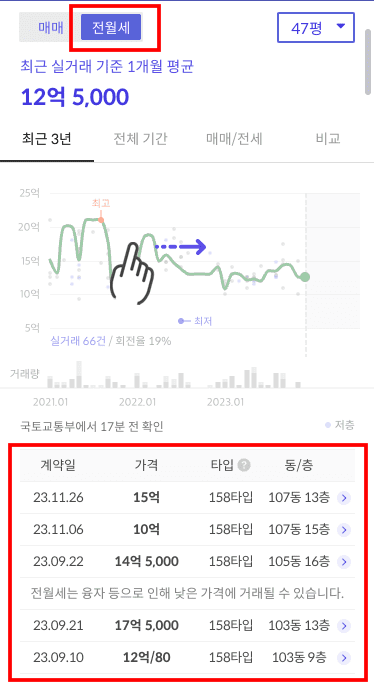 좌측 메뉴에서 최근 실거래가와 계약일, 타입, 동/층 정보를 알 수 있습니다. 전월세 정보도 확인가능하므로 참고하시기 바랍니다.