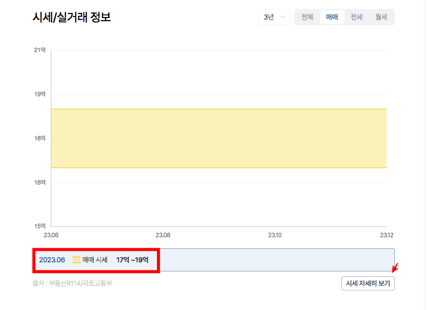 시세/실거래 정보로 이동하면 2023년 6월 매매시세가 17~19억 사이인 것을 확인할 수 있습니다. 우측 하단의 시세 자세히 보기 버튼을 클릭합니다. 여기에서는 3년 시세 최저가와 3년 시세 최고가를 확인할 수 있습니다.