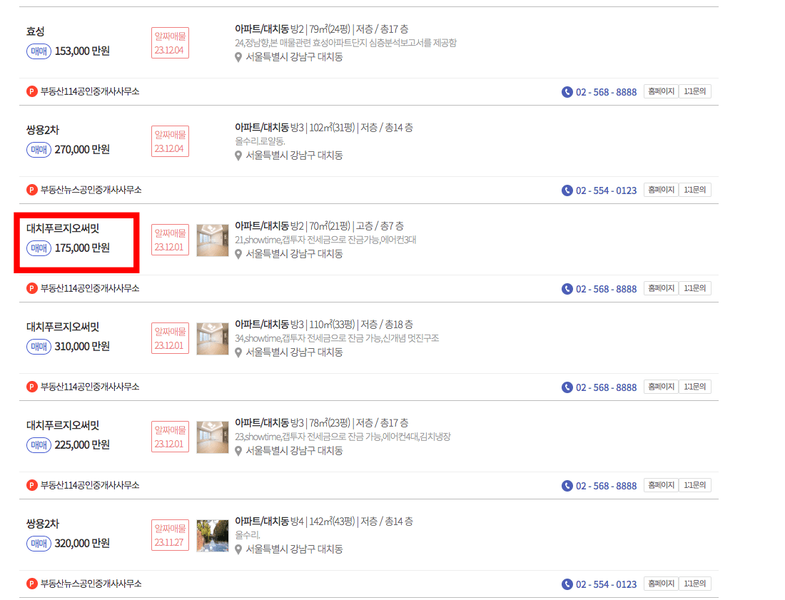 해당 지역의 매물이 표시되면 원하는 매물을 클릭합니다. 여기에서는 대치푸르지오써밋을 알아보겠습니다. 매물정보가 표시되면 시세/실거래를 클릭합니다.