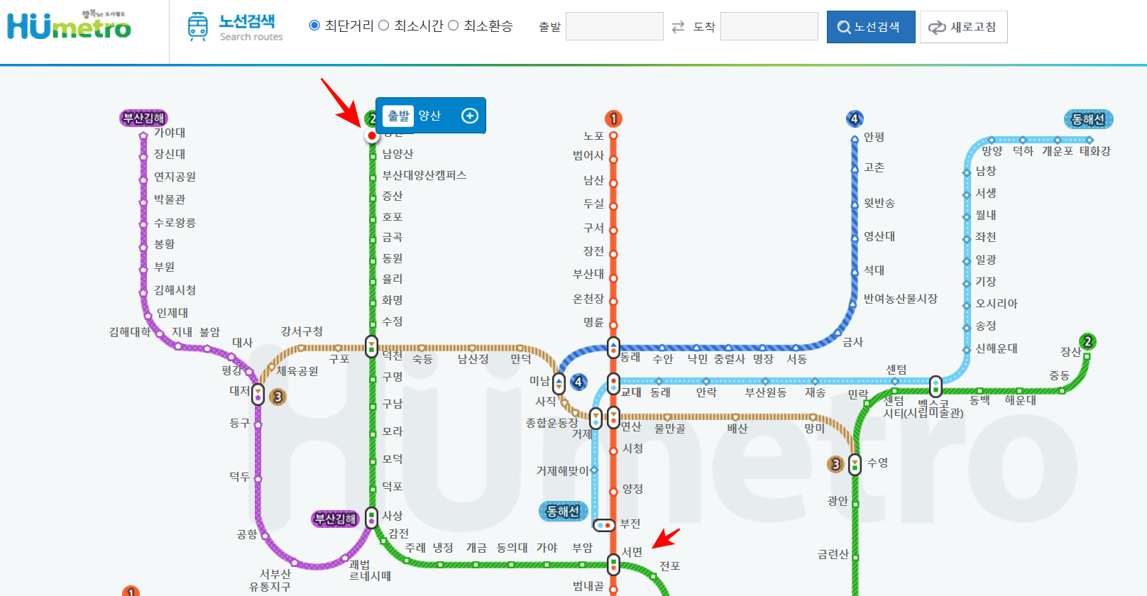 부산 지하철의 노선을 검색하려면 노선도에서 먼저 출발지를 마우스로 선택합니다. 이후 도착역을 클릭하면 출발역에서 도착역까지의 모든 정보를 확인할 수 있습니다. 여기에서는 양산역에서 서면역까지의 노선정보를 확인해 보겠습니다.