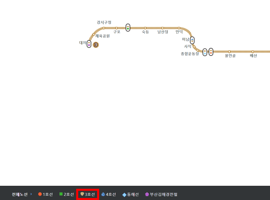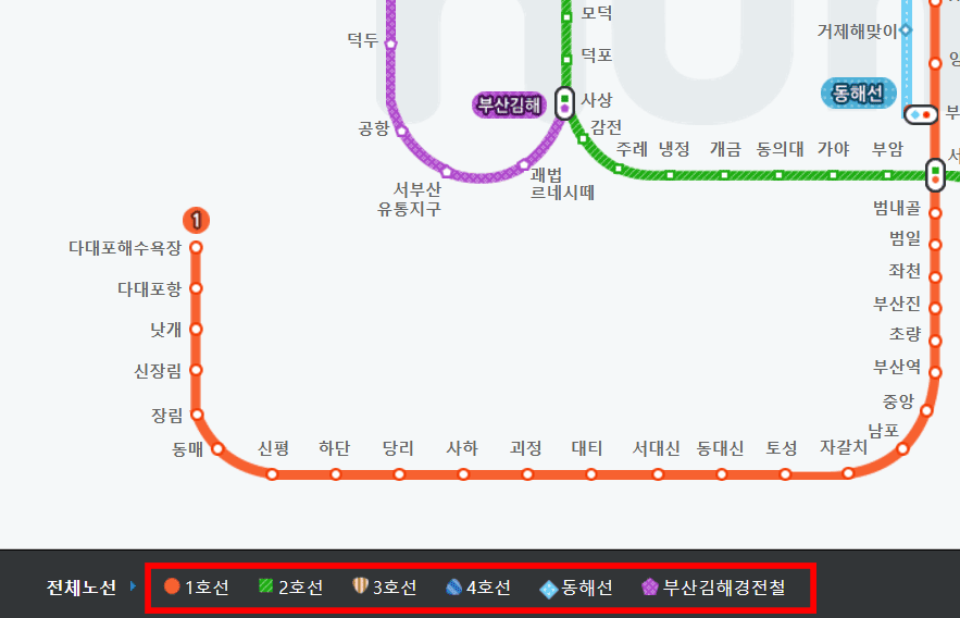 좌측 하단 메뉴를 살펴보시면 전체노선, 1호선, 2호선, 3호선, 4호선, 동해선, 부산김해경전철 총 7가지 메뉴를 볼 수 있습니다. 각 노선을 클릭하면 단일 노선만을 화면에서 확인할 수 있습니다. 이렇게 단일노선만 보면 복잡하지 않게 각 노선을 확인할 수 있는 장점이 있습니다.