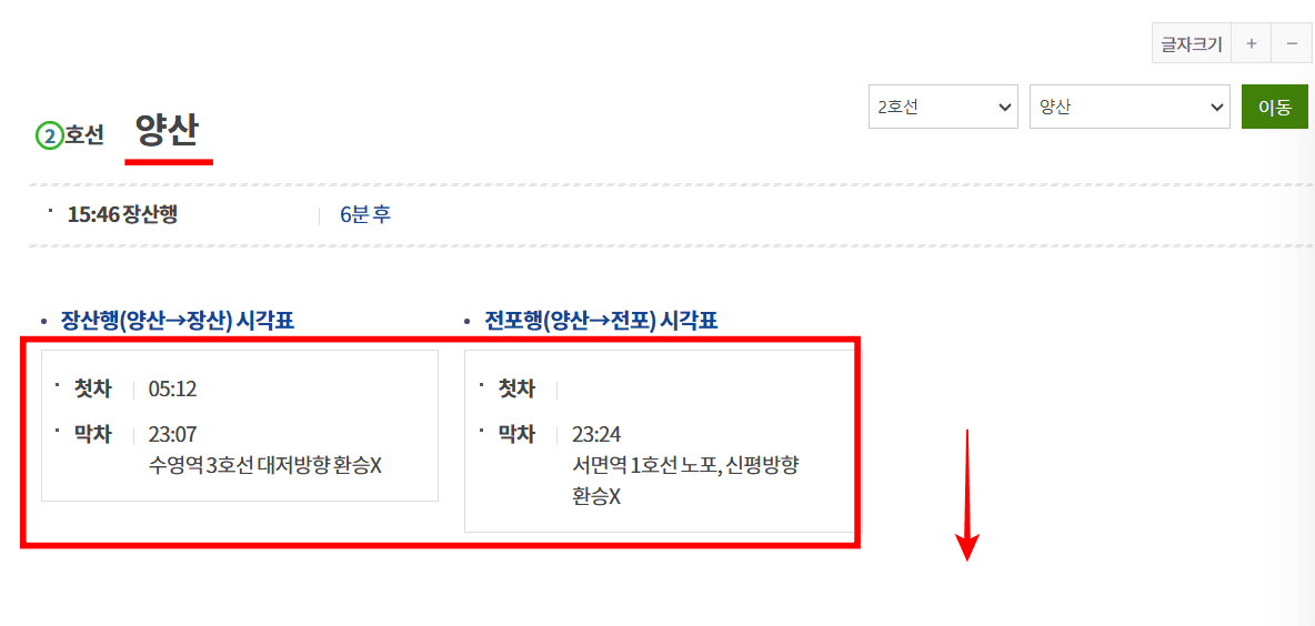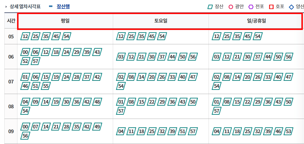 양산역의 시간표를 확인하니 장산행의 첫차와 막차 시간, 전포행의 첫차와 막차 시간을 확인할 수 있었습니다. 스크롤을 내려보면 평일과 토요일, 일요일 및 공휴일의 상세열차 시각표도 확인할 수 있으니 직접 조회해 보시기 바랍니다.