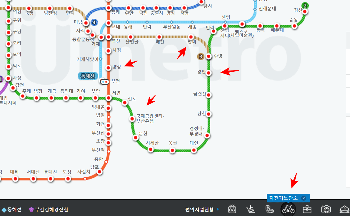 부산 지하철 노선도 우측 하단의 메뉴를 확인하시면 편의시설현황이 아이콘으로 표시된 것을 볼 수 있습니다. 엘리베이터, 휠체어 리프트, 주차공간, 자전거 보관소 등 다양한 편의시설을 보유한 역사를 확인할 수 있습니다.