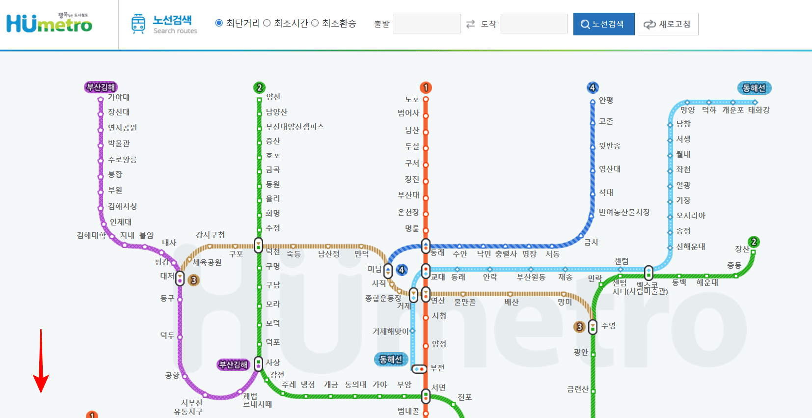 이후 부산 지하철 노선도를 컴퓨터 화면에서 볼 수 있습니다. 마우스를 움직여 지도를 움직일 수 있습니다. 스크롤을 내려 좌측 하단 메뉴를 확인합니다.