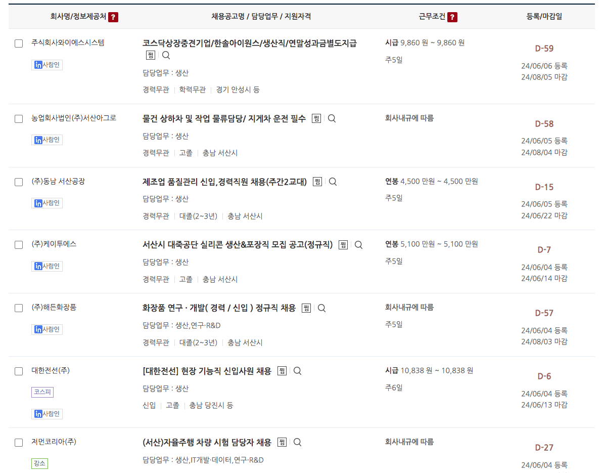 직종별 페이지를 보시면 다양한 직종과 분야에 대한 정보를 확인할 수 있습니다. 금속 관련 기계, 설비, 조작에 대한 채용정보를 확인해 보겠습니다. 희망직종 검색보다 더 다양한 공고를 확인할 수 있으니 직접 확인해 보시기 바랍니다.
