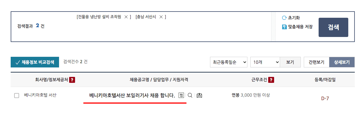 이후 메인 페이지에서 우측 하단의 [검색] 버튼을 선택합니다. 설정된 희망직종에 부합하는 채용공고가 표시되는 것을 확인할 수 있습니다.