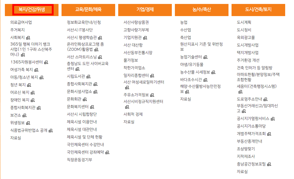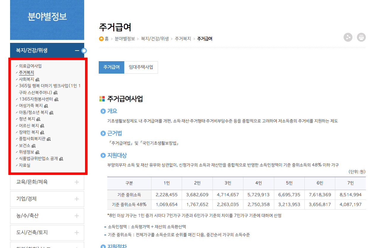 홈페이지에 도착하면 메인 화면이 보입니다. 상단 메뉴에서 [분야별정보]로 마우스를 가져갑니다. 분야별 정보 세부 메뉴가 하단에 보이면 [복지/건강/위생] 메뉴를 선택합니다.