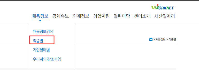 좀 더 광범위한 구인구직 정보를 확인하시려면 홈페이지 상단 우측의 [채용정보]로 마우스를 가져갑니다. 이후 하단에 세부메뉴가 표시되면 [직종별] 메뉴를 클릭합니다.