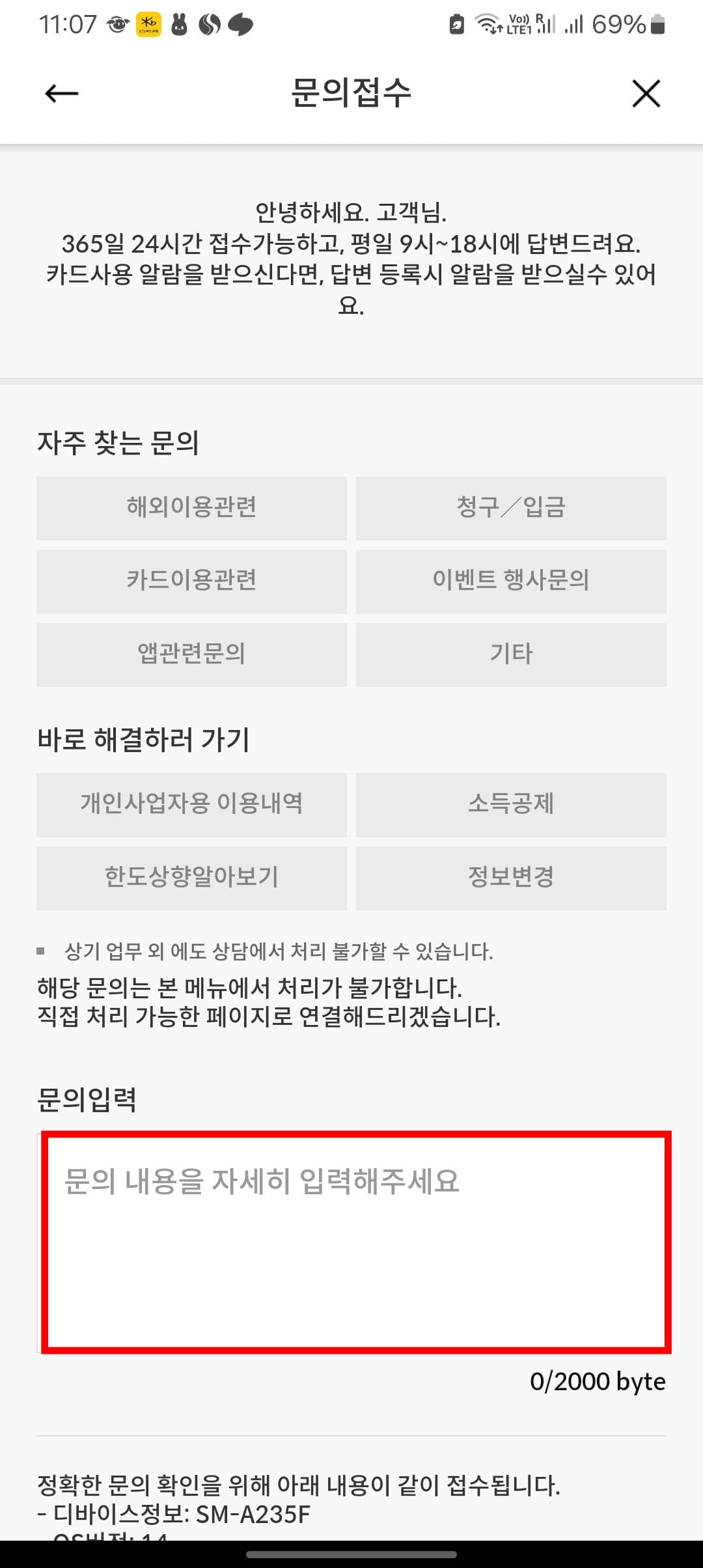 문의접수 페이지에서 문의입력 네모칸에 문의내용을 자세히 입력합니다. 이후 하단의 문의접수를 터치하면 접수가 완료되며 답변은 평일 오전 9시부터 오후6시까지 순차적으로 답변이 됩니다.