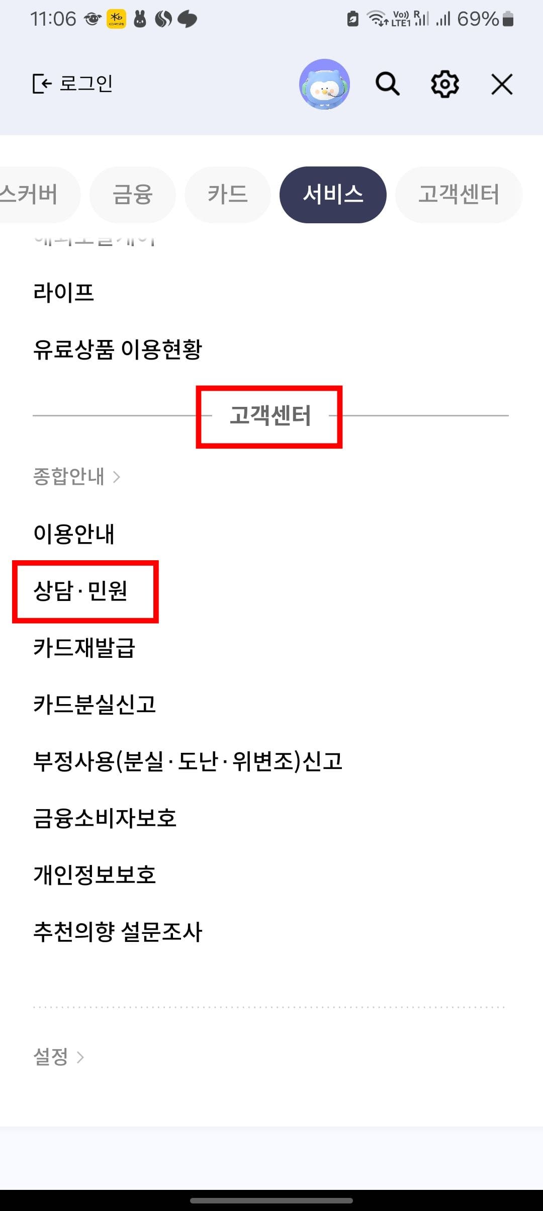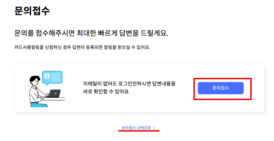 상담, 민원 페이지에서 상담하기 > [문의접수] 메뉴를 터치합니다. 문의접수 페이지에 보이는 [문의접수]를 클릭하면 상담 접수가 가능합니다. 만약 카드사용 알림을 신청한 경우 답변이 등록된 시점에 알림을 받을 수 있습니다.