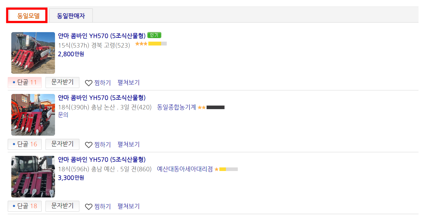 스크롤을 내리면 농기계의 상세한 사진도 확인할 수 있습니다. 또한 제품의 스펙도 확인할 수 있습니다. 최하단에서는 해당 상품과 동일한 모델을 모아서 볼 수 있습니다. 중고농기계 가격 비교 시에 활용하면 좋습니다. 우측의 동일판매자를 클릭하면 해당 매물을 판매하는 사람이 등록한 모든 매물을 확인할 수 있으니 참고하시기 바랍니다.