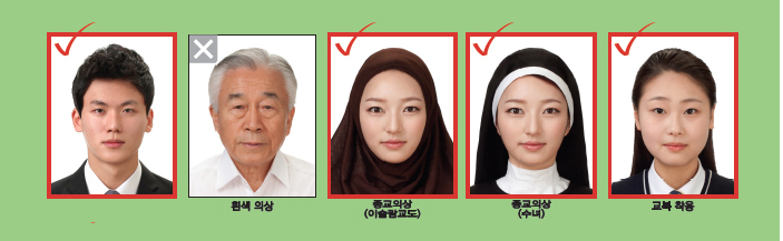 제복이나 군복, 흰색 의상을 착용해서는 안되며 제복 착용은 군인과 경찰 등이 공무여권 신청 시에만 허용이 됩니다. 종교적인 의상은 일상생활 시 항상 착용하는 경우만 허용됩니다.