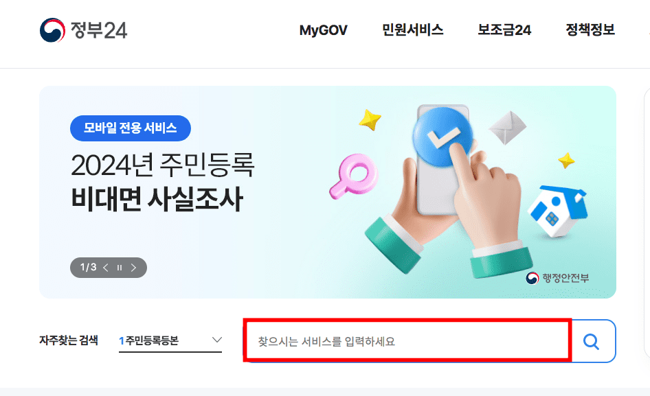 정부24는 정부의 민원 서비스, 정부혜택(보조금24), 정책정보/기관정보 등을 한 곳에서 한 눈에 찾을 수 있고 각 기관의 주요 서비스를 신청·조회·발급할 수 있는 대한민국 정부 대표 포털입니다