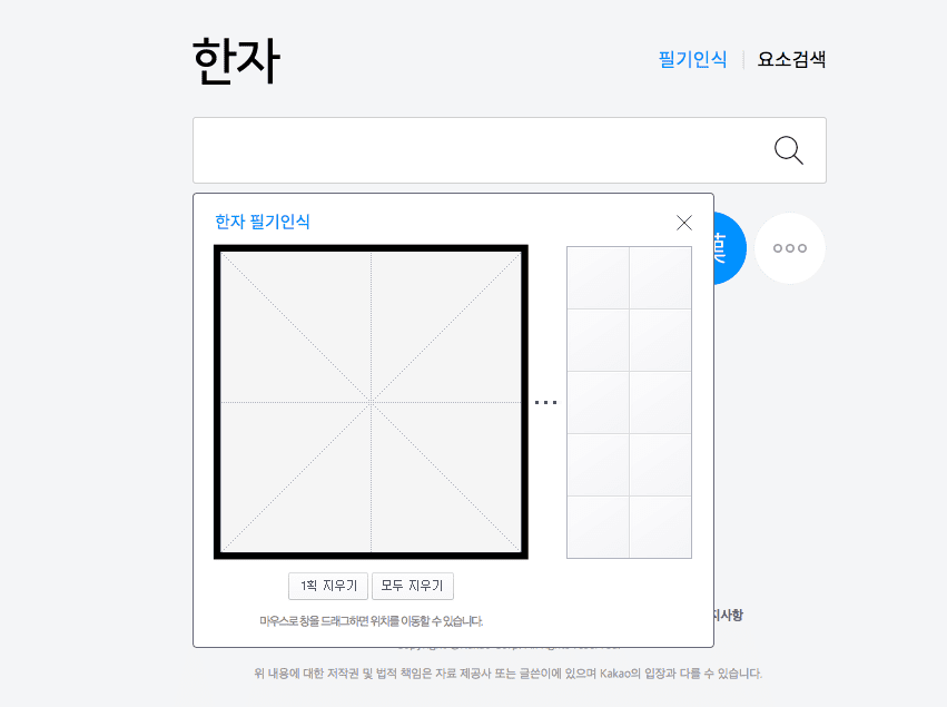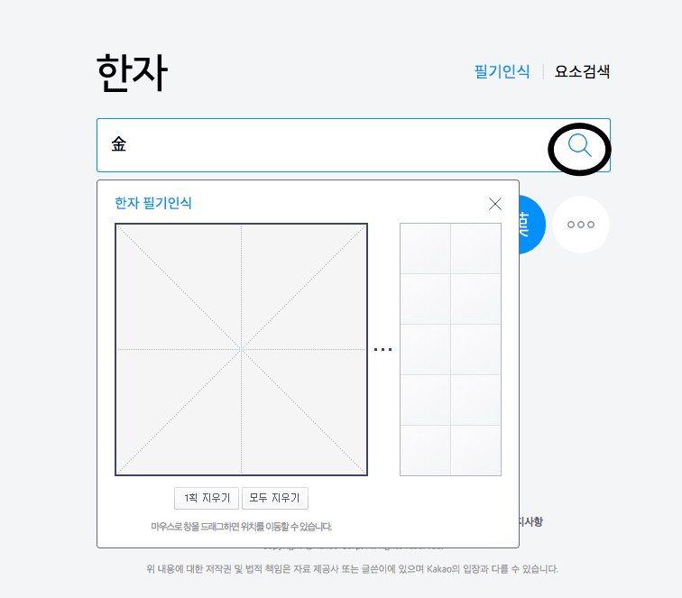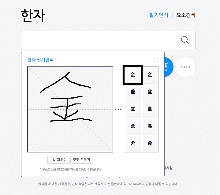 이번에는 메인 페이지로 돌아와 필기인식을 클릭합니다. 필기인식은 옥편 한문찾기를 직접 그려서 할 수 있는 기능입니다. 한자 필기인식이 가능한 네모난칸안에 마우스로 검색하고 싶은 한자를 그립니다. 한자가 모두 그려졌으면 우측에서 유사한 한자들이 검색됩니다. 가장 위의 한자를 클릭하면 입력창에 복사됩니다. 이후 우측의 검색 아이콘을 클릭합니다.
