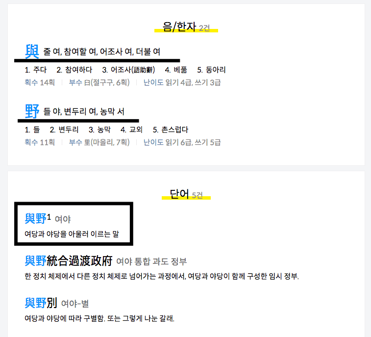 다음 한자 사전 홈페이지에 방문하시면 위와 같은 화면을 볼 수 있습니다. 뉴스 기사에서 발췌한 (與野)라는 한문을 찾아보도록 하겠습니다. 입력창에 찾고 싶은 한문을 붙여 넣기하고 우측의 검색 아이콘을 클릭합니다.