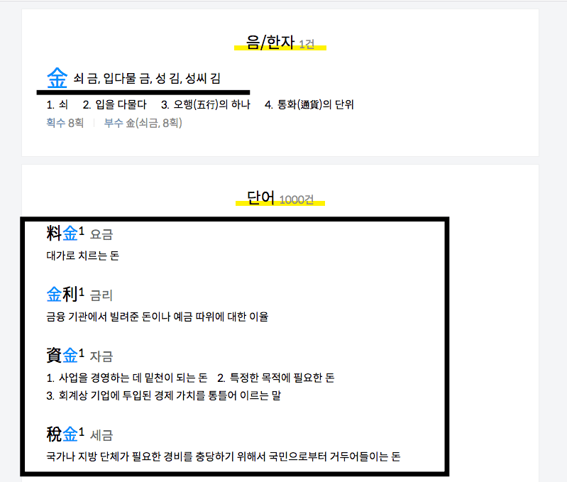 스크롤을 내리면 쇠금이 부수로 사용된 한자들도 찾아볼 수 있습니다.