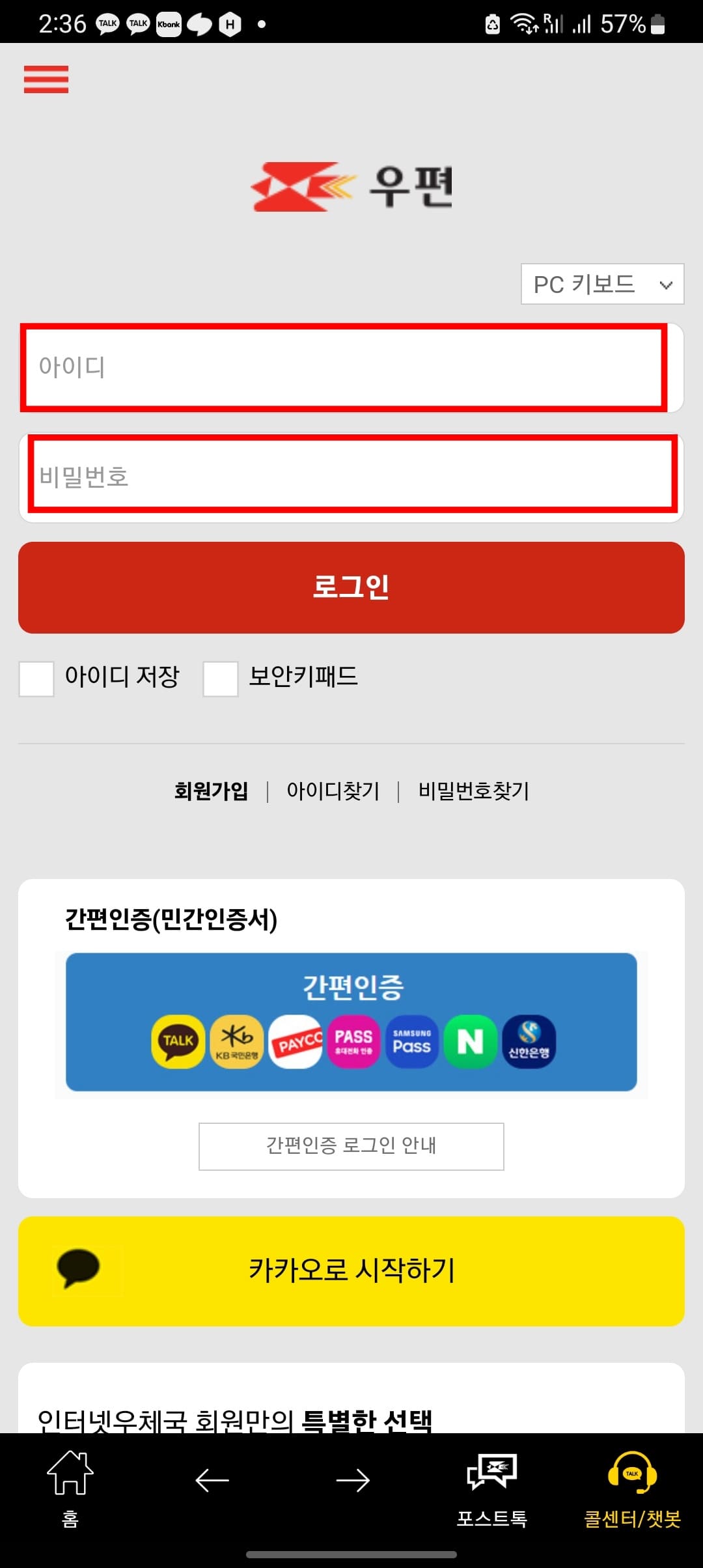 등기 조회를 하려면 우체국 홈페이지 로그인이 필요합니다. 회원가입이 되어 있지 않으시다면 하단의 카카오로 시작하기를 클릭하여 간단한 가입후 아이디와 비밀번호를 입력하고 로그인 버튼을 클릭합니다.