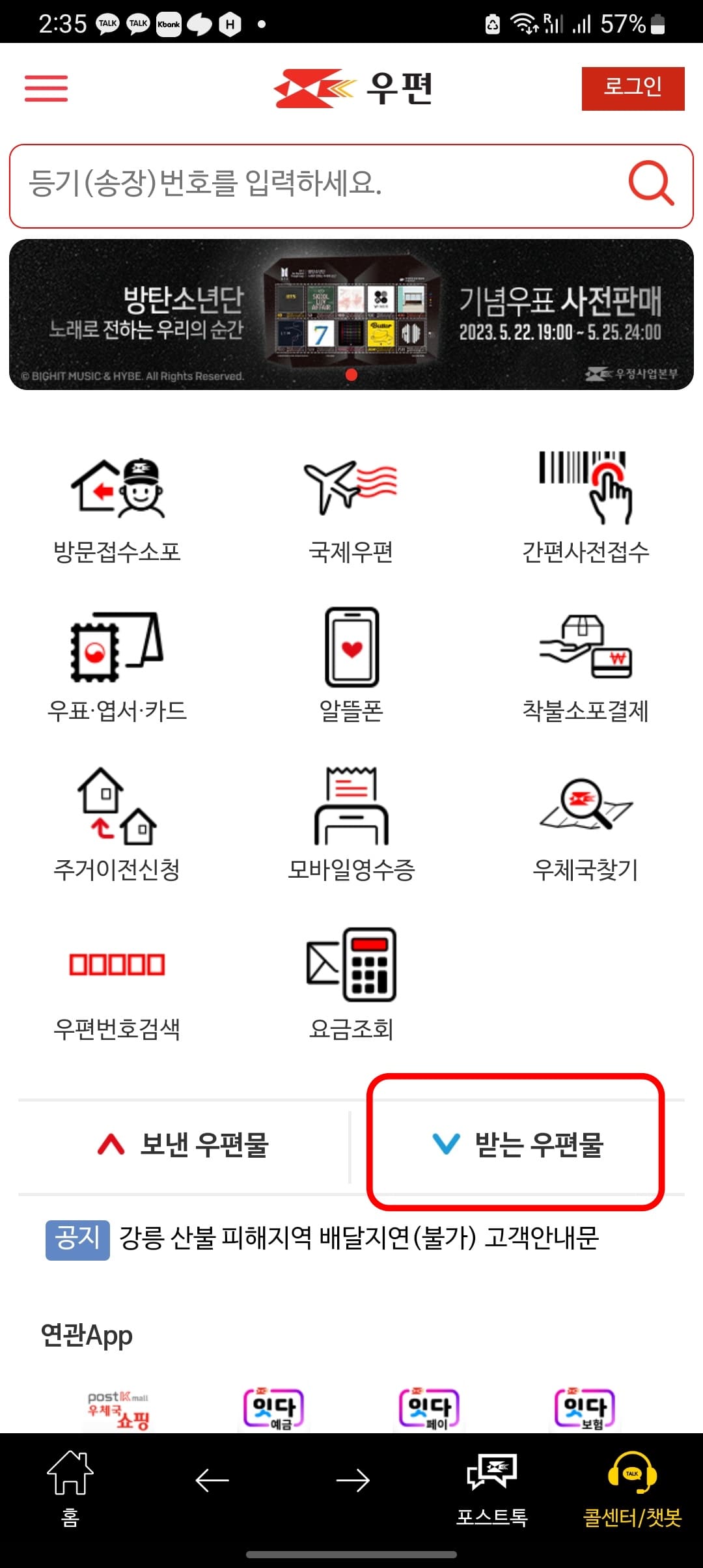 모바일에서 우체국 등기번호를 조회하시려면 플레이스토어 또는 앱 스토어에서 우체국 어플을 설치하시기바랍니다. 우체국 모바일 어플을 실행하시면 위와 같은 메인 화면을 볼 수 있습니다. 여기에서 하단의 받는 우편물 메뉴를 터치합니다.