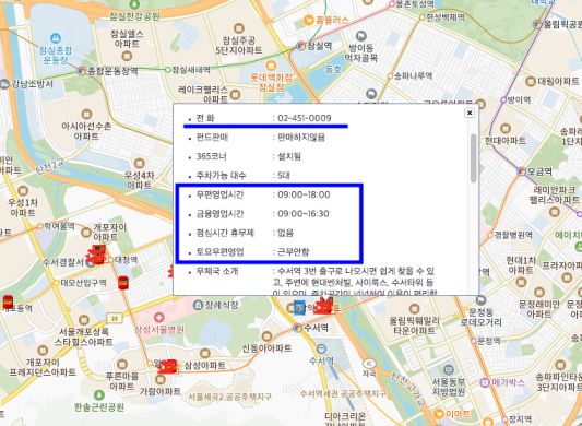 이후 지도에 표시된 우체국 아이콘을 클릭하면 전화번호, 영업시간, 금융영업시간, 점심시간 휴무제 등에 대한 세부 정보를 확인할 수 있습니다. 가장 정확한 방법은 해당 우체국으로 전화를 하여 점심시간이나 영업시간에 대해 문의하는 것입니다.