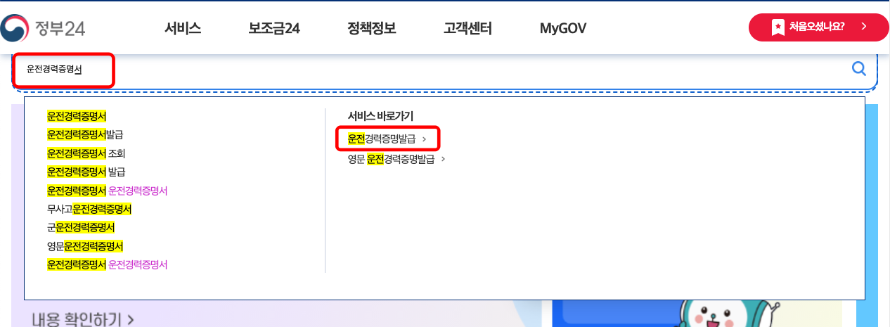 정부 24 홈페이지에 방문하면 상담 메뉴 바로 밑 검색란에 ‘운전경력증명서’를 입력하고 하단에서 서비스 바로가기 > 운전경력증명발급을 클릭합니다.