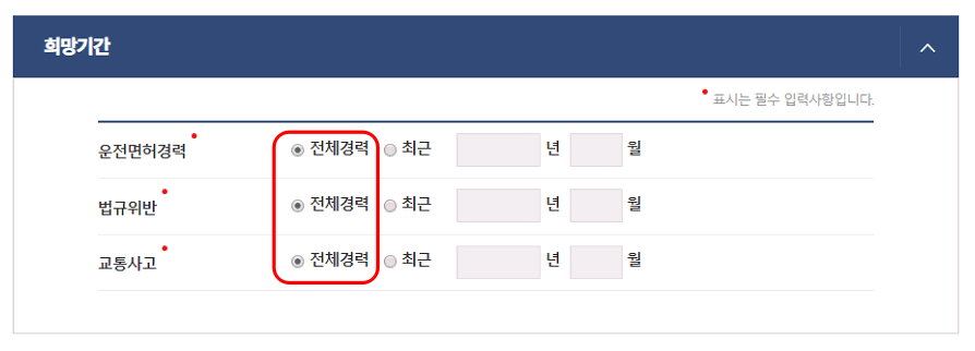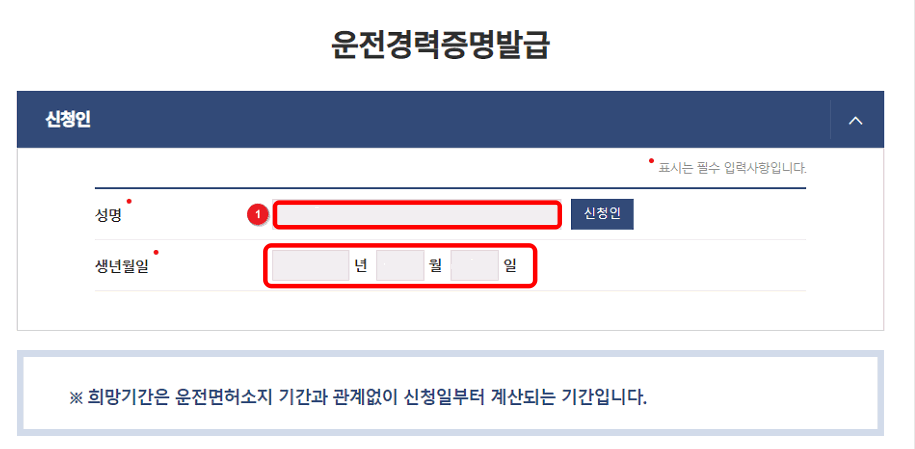 민원안내 및 신청 페이지가 표시되면 하단에서 발급 버튼을 클릭합니다. 운전경력증명발급 창이 표시되면 신청인 정보에 성명과 생년월일을 입력합니다. 이어서 희망기간을 설정하거나 전체경력으로 설정합니다.