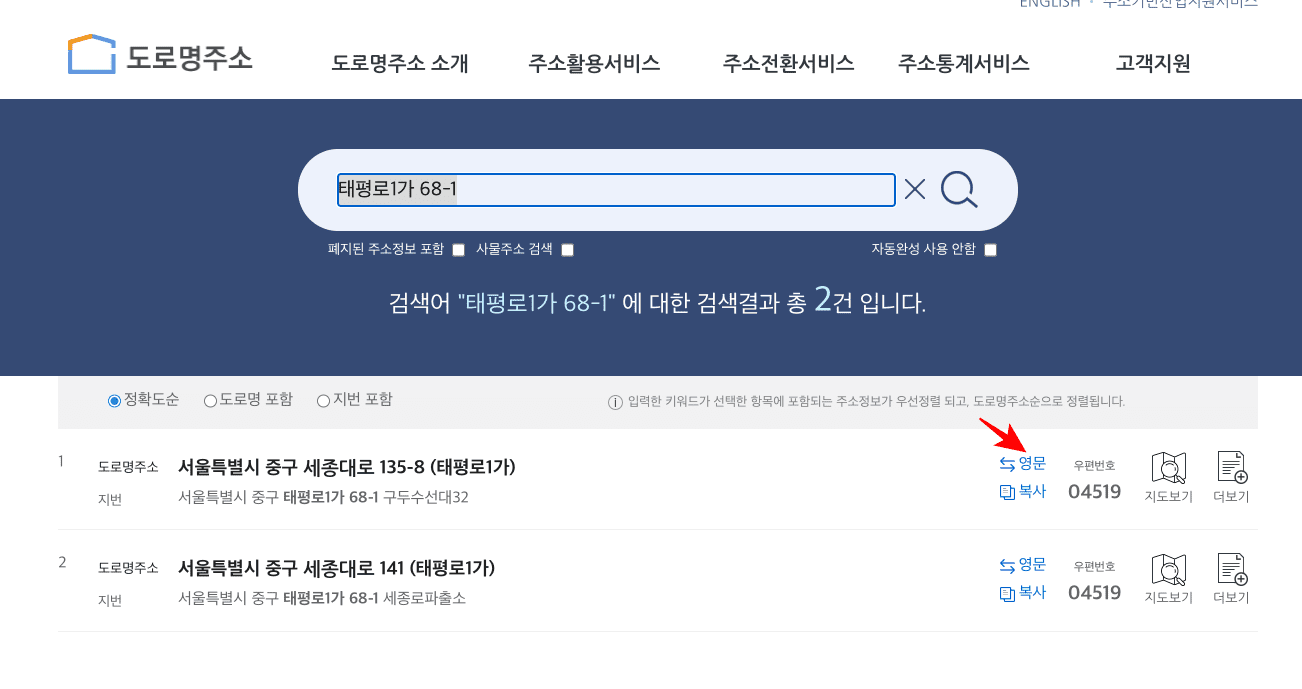 검색결과가 표시되면 해당 주소의 도로명 주소가 2개 표시되는 것을 확인할 수 있습니다. 해당 주소가 맞다면 우측의 영문 메뉴를 클릭하여 영문 주소로 변환할 수 있습니다. 영문 주소는 해외구매나 해외에서 거주지 등록을 할 때 사용하면 됩니다. 우측 메뉴에서 지도 보기 메뉴를 선택해 보겠습니다.
