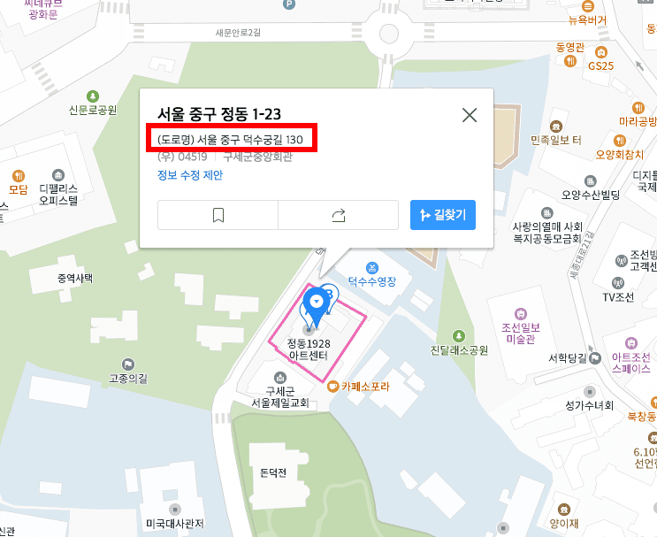 이해를 돕기위해 새로운 지번주소를 검색해 보겠습니다. 이번에도 서울특별시 중구 정도 1-76에 대한 도로명주소 서울특별시 중구 덕수궁길 140 임을 확인할 수 있었습니다. 우측 지도 보기를 클릭하여 덕수궁길에 대해 알아보겠습니다. 해당 장소가 지도 위에 표시되면 우측 하단의 [도로구간보기]를 선택합니다.