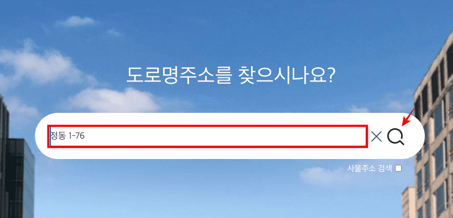 주소정보누리집에 도착하시면 위와 같은 메인 화면을 보게 됩니다. 중앙 입력창에 도로명주소를 알고 싶은 지번주소를 입력하고 우측의 돋보기를 클릭합니다.