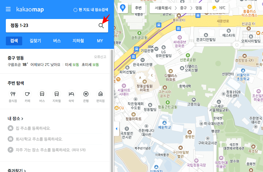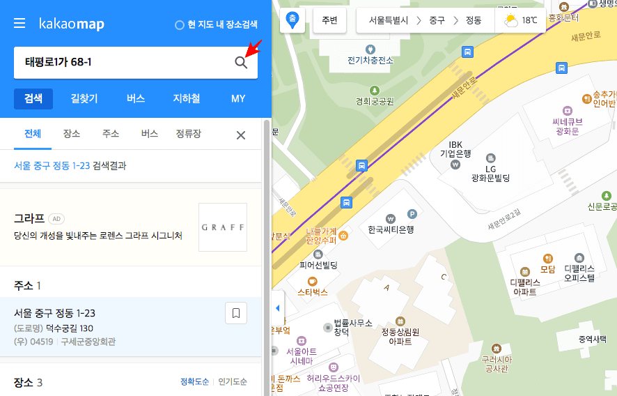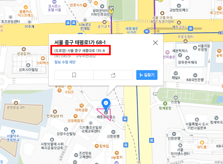 같은 방법으로 다른 지번주소를 검색해 보겠습니다. 좌측 상단 입력창에 새로운 지번주소를 입력하고 우측 돋보기 아이콘을 클릭합니다. 서울 중구 태평로 1가 68-1의 도로명 주소는 서울 중구 세종대로 135-8인 것을 지도에서 확인할 수 있으니 직접 확인해 보시기 바랍니다.
