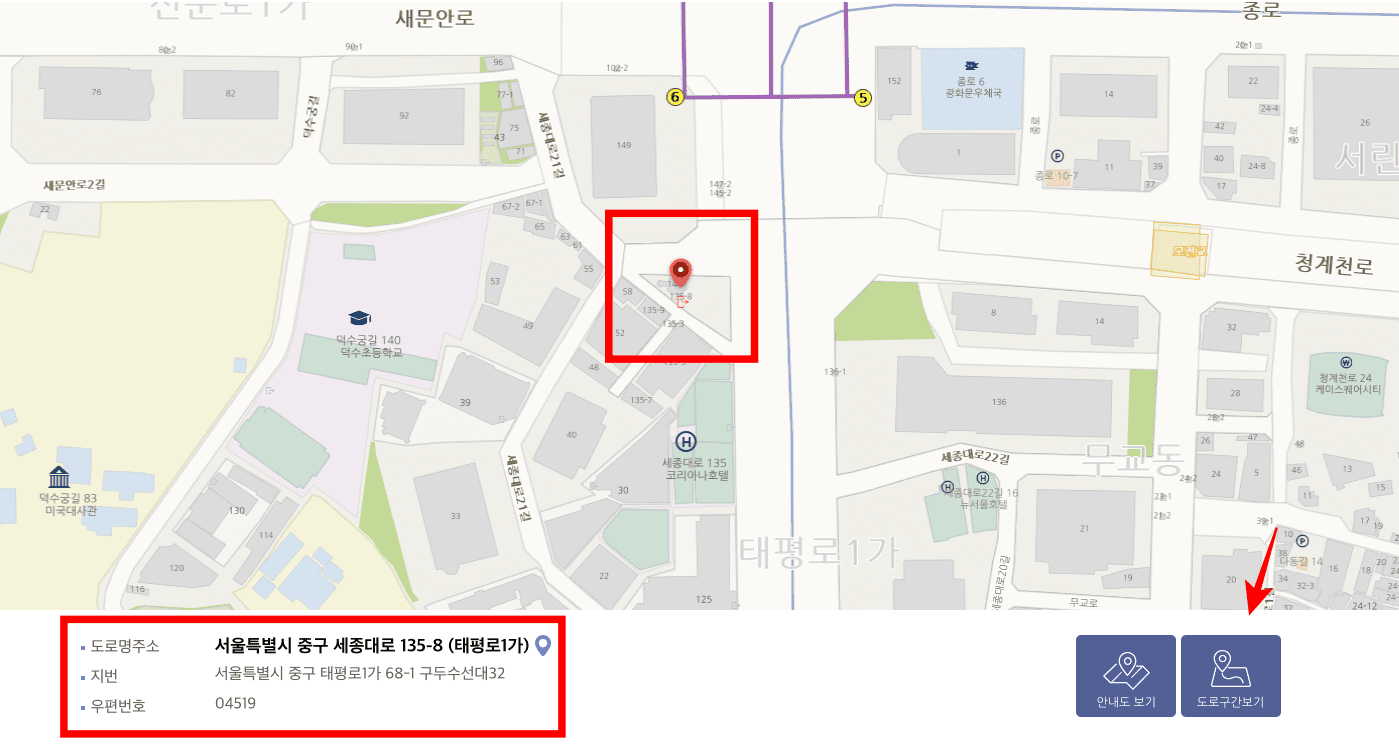 지도 보기는 해당 주소지를 지도에서 확인할 수 있으며 마찬가지로 도로명주소, 지번주소, 우편번호를 제공합니다. 도로명주소에 대한 이해도를 높이려면 우측 하단의 [도로구간보기] 메뉴를 선택합니다.