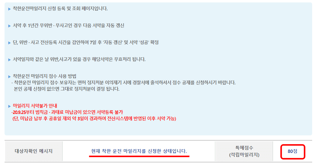 오늘은 착한운전 마일리지 인터넷신청 방법 두 가지를 살펴보았습니다. 저는 자동차 운전을 하고 있지만 현재까지 80점의 마일리지를 모을 수 있었습니다. 여기서 말하는 무위반이란 과태료 처분을 받지 않은 것을 말하며 무사고란 사람을 사망이나 상해에 이르게 하는 교통사고를 유발하지 않은 것을 의미함을 기억하시기 바랍니다.