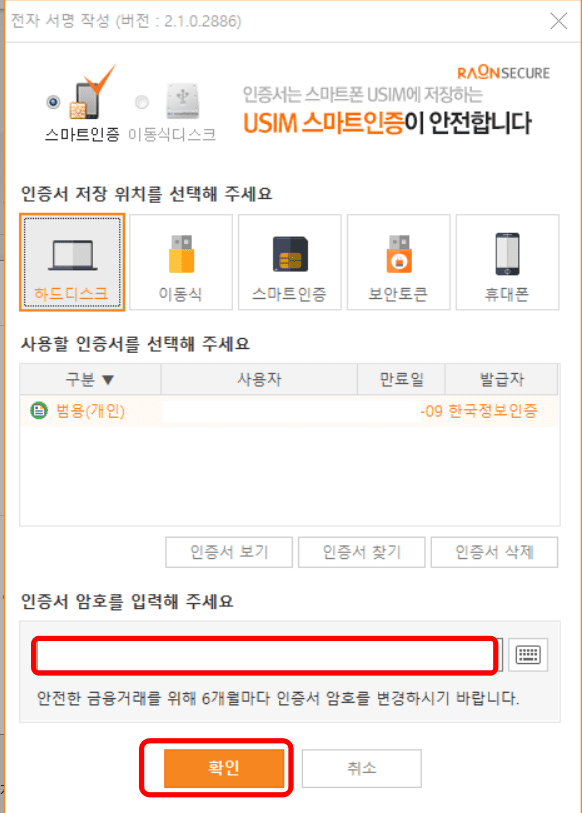 공동인증서를 선택하고 성명과 주민번호를 입력한 뒤 하단 공동 인증서 로그인 버튼을 클릭합니다. 팝업창이 뜨면 인증서를 선택하시고 비밀번호를 입력한후 확인버튼을 클릭합니다.